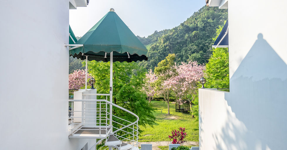 從房內望出,可遠眺 層層山景,隨著季節更迭,欣賞 春日粉櫻 與 秋季金黃落羽松,感受山林四季的靜謐美好。